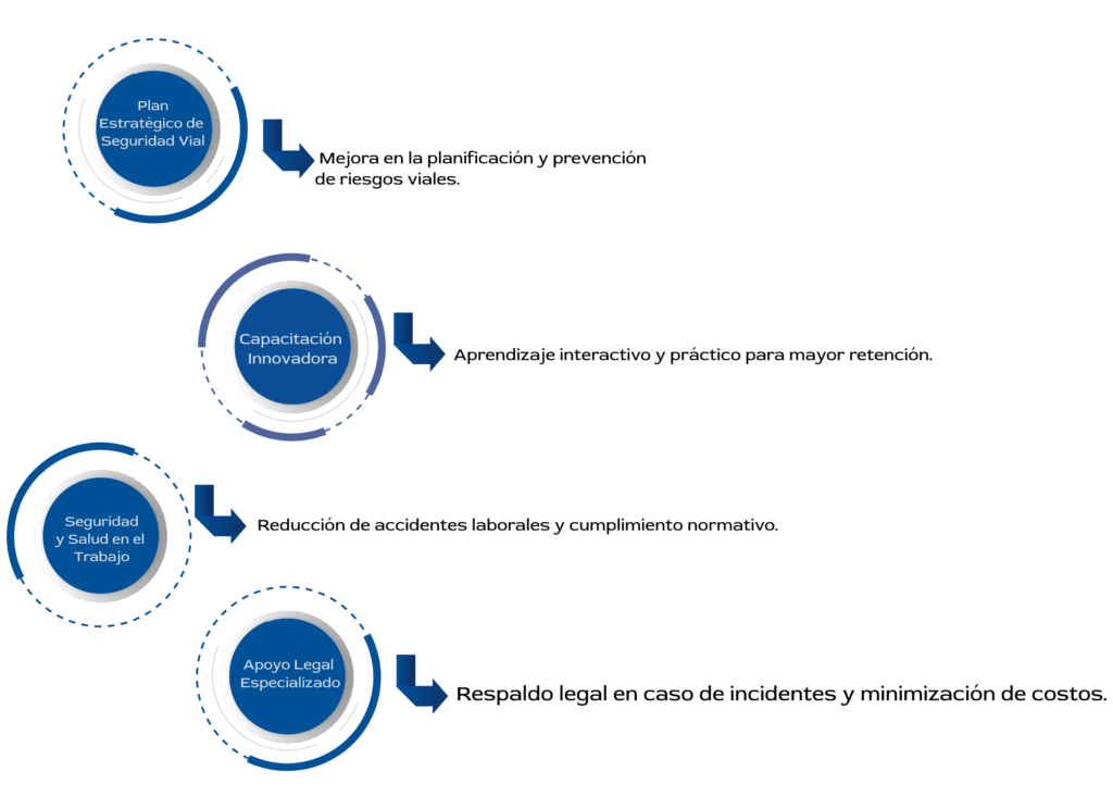 Te ofrecemos acceso a un conjunto integral de servicio de capacitación, que incluye el diseño y la implementación de planes estratégicos de seguridad vial y su desarrollo. También realizamos auditorías a estos planes, elaboramos rutogramas y proporcionamos capacitaciones presenciales sobre seguridad vial con el uso de herramientas de realidad virtual. Además, diseñamos e implementamos el sistema de seguridad y salud en el trabajo y contamos con abogados especializados en responsabilidad civil. Permítenos tomar el control por ti. Nuestra misión es transformar un momento desafiante en una experiencia eficiente.